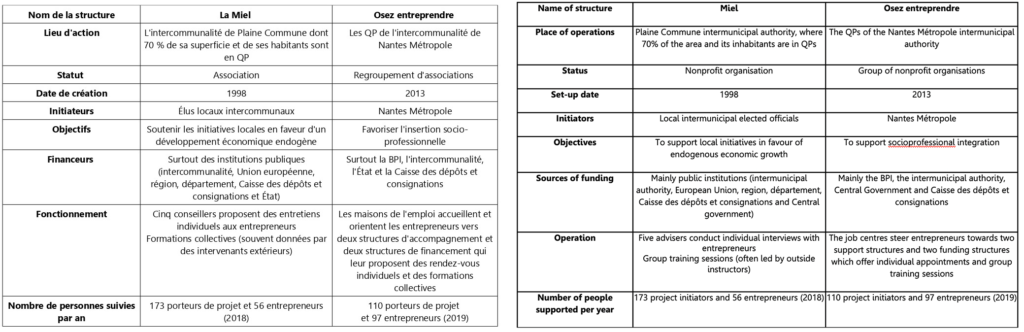 Access to entrepreneurial resources in QPs raises the question of where and how the structures support to business creation, and who benefits. The answers provided in this article draw on two 18-month field studies. The first investigates a nonprofit organisation located in Saint-Denis (93) called the “Maison de l’initiative économique locale” (Miel)—the centre for local economic initiative. It supports anyone interested in setting up or developing a business located in Plaine Commune. The Miel consists of five advisers, one of whom manages the Pépinière, a support structure dedicated to business projects with high development potential. The second field study looks at a structure called “Osez entreprendre”, which supports business creators in the 15 QPs located within the Nantes urban area. This entity consists of four structures that support and/or provide funding for any individual located in a QP in setting up and growing their business (figure 1).