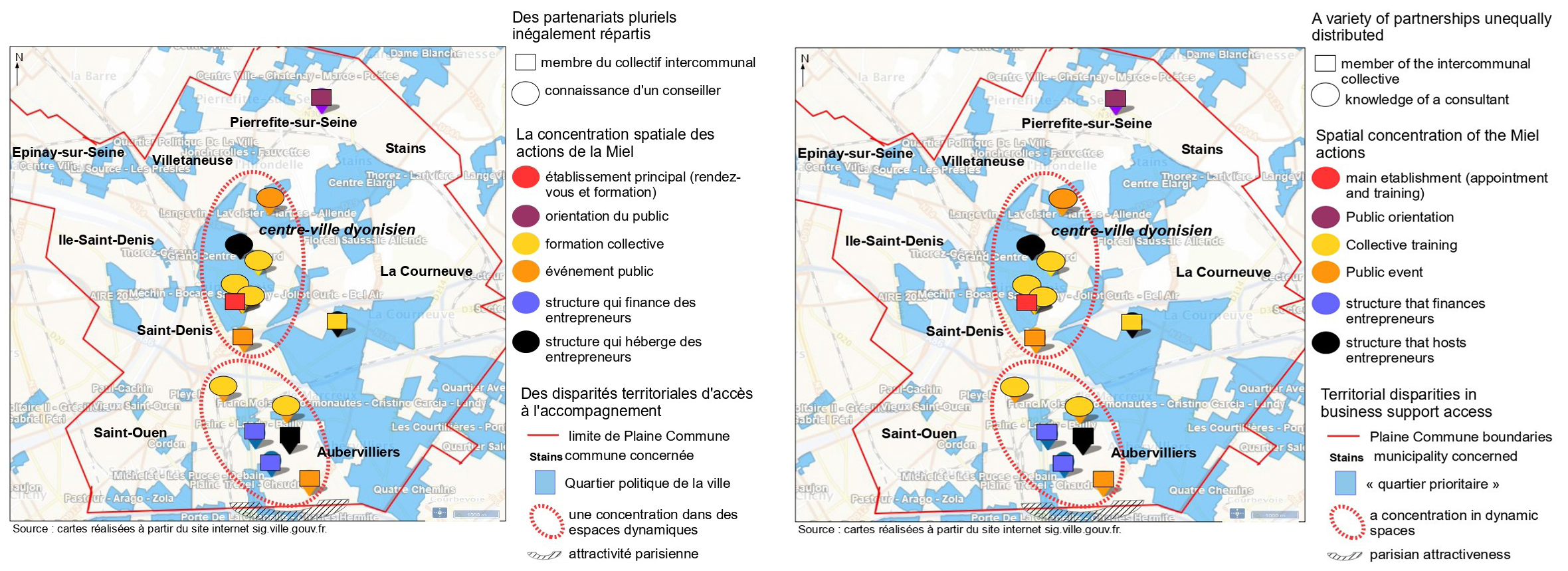 Located in Seine-Saint-Denis, the Miel’s operations are also distributed unequally across the intermunicipal area. The figure 4 shows how its events predominantly take place in the town centre and close to Paris. It is less active in the QPs in Épinay-sur-Seine, Villetaneuse or Stains. While the head of the Miel justifies the location of these sites by emphasising their accessibility from different parts of the intermunicipal zone, the activity reports show differences in support for entrepreneurs depending on their place of residence. In 2019, the Miel supported few entrepreneurs from La Courneuve, Villetaneuse or Pierrefitte-sur-Seine relative to their demographic weight in the intermunicipal area. For example, La Courneuve accounts for 10% of the population of Plaine Commune, but only 5% of the entrepreneurs supported. Their overall proportion has declined since 2016, whereas the number of entrepreneurs from Saint-Denis, Stains or Aubervilliers receiving support has increased. In other words, Miel’s resources benefit inhabitants of the closest or best served municipalities, especially given that the advisers do not travel much around the city’s different QPs. Moreover, the municipalities with the most geographical advantages correspond to economically dynamic areas where support for entrepreneurship has political backing. In Saint-Denis, where one of the elected officials is head of the Miel, the municipality makes its own managed premises available to entrepreneurs.
