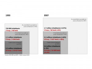 The generalised withdrawal of the public authorities as underlain by a neoliberal logic, leads to their neglecting their role as developers and town planners to the benefit of a development by project with no holistic vision. We can see on the one hand a concentration of means in the central hospitals, and on the other the privatisation of the sector. These two processes are producing an increase in the inequalities in accessibility to hospital structures, linked on the one hand to the spatial distribution of the offer on the territory, and on the other to the population’s economic capacity for accessing healthcare.