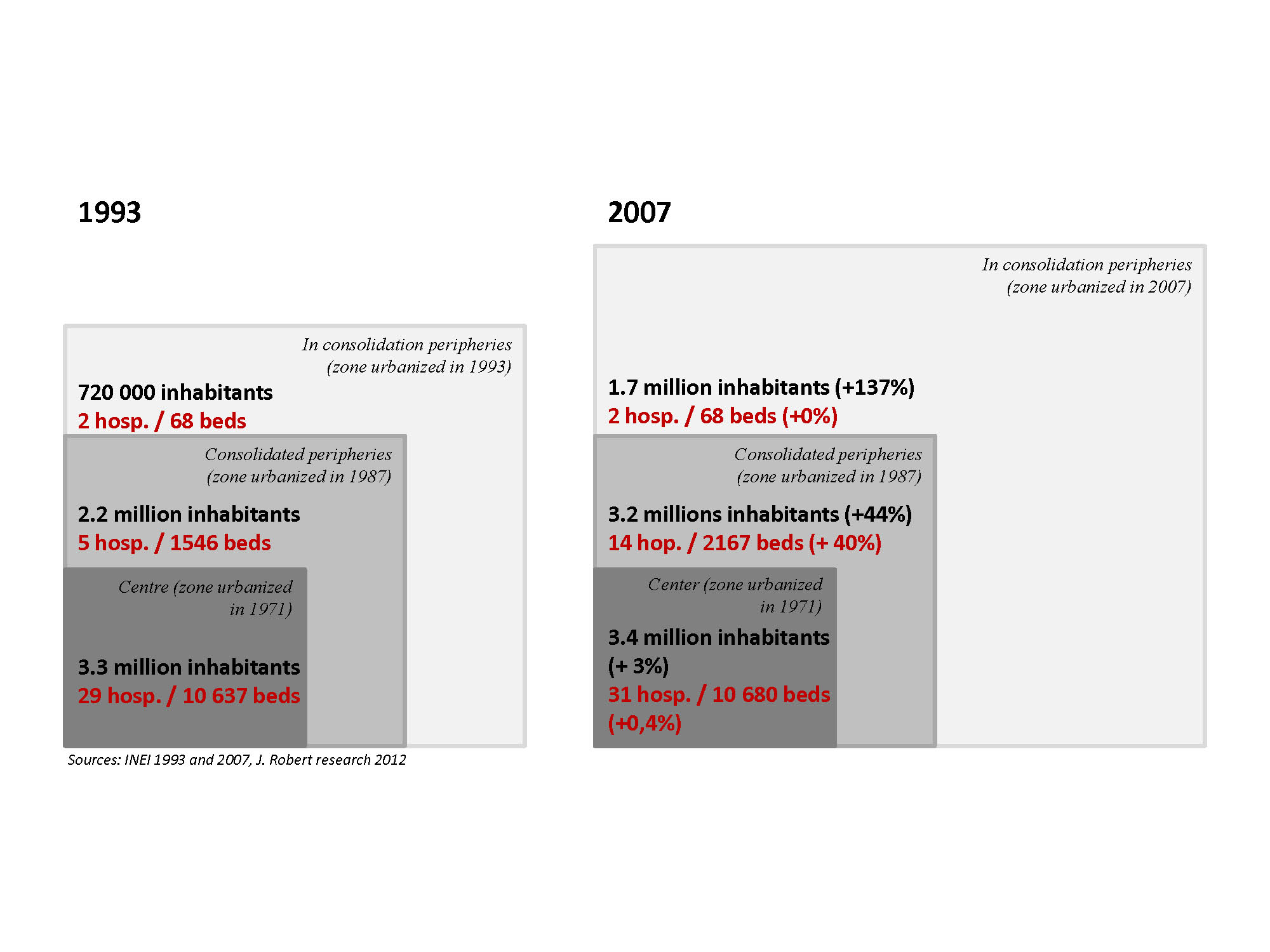L’évolution comparée de la population et du nombre de lits dans les hôpitaux publics ces dernières années montre en effet un accompagnement inégal du dispositif de soins en réponse à de nouvelles demandes. La construction de 11 nouveaux établissements (environ 700 lits) entre 1993 et 2007 renforce l’offre de soins dans le « centre » et dans la « périphérie consolidée »(les zones périphériques urbanisées avant 1987 caractérisées par une densité du bâti relativement importante -maisons à plusieurs étages, une bonne connexion aux différents réseaux -eau, assainissement, électricité, et de relativement bons équipements -voirie, parcs, etc.) qui connaît une augmentation de population de 44%. C’est aussi dans ces zones que sont renforcées les capacités des grands hôpitaux déjà existants et que s’est développée une offre privée hyper ségrégative. Les nouvelles périphéries, qui correspondent aux espaces urbanisés à partir de 1987, connaissent la plus forte croissance (presque plus d’un million d’habitants en 14 ans) sans voir apparaître de nouvelles infrastructures hospitalières. Concentrant les populations sans assurance ou avec SIS, ce sont aussi les zones avec le moins d’alternatives. Ces périphéries apparaissent de fait marginalisées avec une offre de soins insuffisante, assurée quasi exclusivement par le ministère de la Santé. Cette évolution du dispositif de soinsdéfavorise encore davantage les populations des périphéries qui souffrent déjà de difficultés d’accès au logement, de la pauvreté etc.