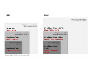 The compared evolution of the population and the number of beds in public hospitals these last years, shows that in response to new demands, the healthcare system was not being developed equally. The construction of eleven new establishments (adding up to around 700 beds) between 1993 and 2007, reinforced the healthcare offer in the “central part of town” and in the “consolidated outskirts” (both areas being already urbanised in 1971 and 1987 respectively), thereby matching the population increase in the consolidated outskirts in particular. It is also in these areas that the capacity of the large hospitals which existed already had been reinforced, and that a hyper segregative private offer had been developed. The new outskirts, corresponding to areas which had been urbanised from 1987 onwards, experienced the highest growth (with more than one million or so inhabitants in 14 years), and no apparent hospital infrastructures. Where these areas concentrated populations without insurance or with SIS, these were also the areas with the least options. As a result, the outskirts appeared marginalised with an insufficient healthcare offer, which was taken care of almost exclusively by the Health Ministry. In the end, this evolution of the healthcare system highlighted the disadvantaged status of the populations living on the outskirts with, among other things, access to housing being made more difficult and poverty worsening.