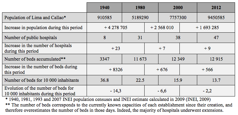 Table 1: Evolutions of the healthcare offers vs demographic growth in Lima and Callao between 1940 and 2012