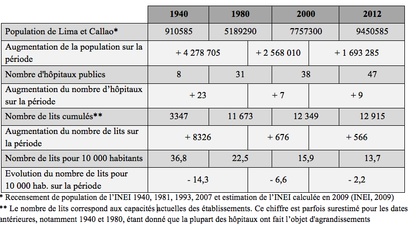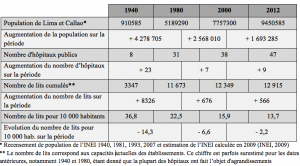 Tableau 1 : Évolutions de l’offre de soins vs croissance démographique à Lima et Callao entre 1940 et 2012