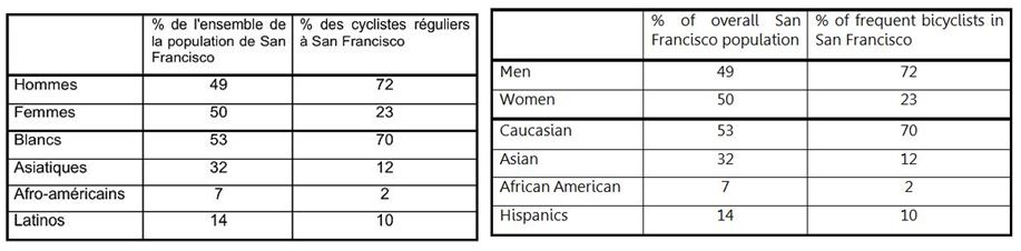 Le danger lié à la circulation est un frein important, en particulier pour les femmes, les enfants et les personnes âgées, et ils « préfèrent largement les moyens de transport qui leur offrent plus de protection par rapport à la circulation motorisée » (Pucher et Buehler, 2010). Lorsqu'ils ne se sentent pas en sécurité en vélo, ces groupes n'envisagent même pas de s'y mettre. San Francisco en est un exemple. 49 % de la population de San Francisco est masculine, et 50 % est féminine (Recensement de la Baie de San Francisco, 2010) ; cependant, la majorité des cyclistes réguliers à San Francisco sont des hommes (72 %), blancs (70 %), qui ont entre 26 et 35 ans ; seuls 23 % des cyclistes réguliers sont des femmes (Agence de Transport Municipal de San Francisco - SFMTA, 2008). Les Asiatiques constituent 32 % de la population de la ville, mais ils ne sont que 12 % à faire du vélo régulièrement. Il en est de même pour les Afro-américains (7 % pour 2 % de cyclistes) et les Latinos (14 % pour 10 % de cyclistes) (tableau 1). Parmi les freins au vélo, entre 71 et 79 % des personnes interrogées indiquent qu'elles ne se sentent pas à l'aise de partager la route avec les voitures, et entre 75 et 80 % déclarent qu'il n'y a pas suffisamment de voies cyclables (SFMTA, 2008). Selon l'étude de Pucher et Buehler (2008), dans les pays disposant de nombreux aménagements cyclables (comme les Pays-Bas), la pratique du vélo concerne assez également les différents groupes d'âges et de genre.