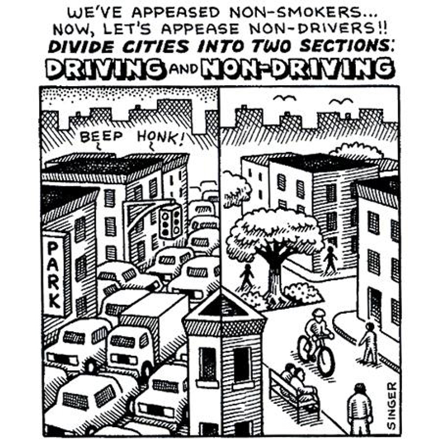 Andy Singer illustre ceci en dessinant des parallèles entre ceux qui ne conduisent pas et ceux qui ne fument pas (figure x). L'illustration laisse entendre que, tout comme la cigarette est interdite dans les lieux publics parce qu'elle est mauvaise pour la santé, pour le moins, dans une même veine, des infrastructures adaptées aux besoins d’air pur et de modes de vie physiquement actifs et sains des cyclistes doivent être revendiquées.
