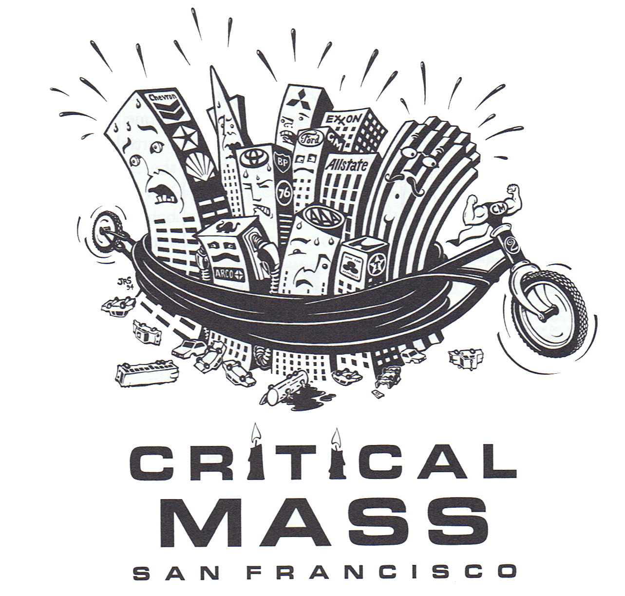 À San Francisco, chaque dernier vendredi du mois depuis 1992, qu’il pleuve ou qu’il vente, des cyclistes se rassemblent sur la place Justin Herman vers 18h. Quand ils estiment être suffisamment nombreux pour réclamer la priorité en toute sécurité, ils prennent le départ tous ensemble et inondent petit à petit Market Street. Au moment même où les automobilistes rêvent de rentrer chez eux, des centaines de cyclistes se mettent à tourner autour de la place, bloquant la circulation sur Embarcadero dans les deux sens. Ils roulent entre les voitures, diffusent de la musique à travers des haut-parleurs qu’ils transportent sur leurs vélos, et poussent des acclamations. Après plusieurs tours de la place, la Masse Critique (MC) poursuit parfois sa route vers d’autres quartiers de la ville, le convoi s’étirant parfois sur plus d’un kilomètre.