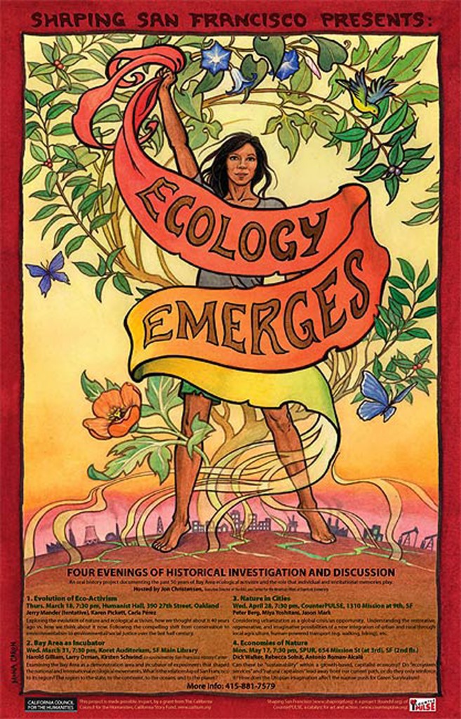Years after the 1997 ride, participants of CM continue to acknowledge the political benefits of meeting each month during the rides. One of the obstructions that Randall referred to was the San Francisco bike injunction that delayed the city’s implementation of a bike plan from 2006 to 2010.[9] The bicycle communities’ political influence extends beyond immediate bicycling matters. Organizers fighting for or against environmentally important state ballot initiatives often target CM for collecting signatures. CM gatherings are places numerous other events are announced too, such as a talk series on the San Francisco Bay Area’s history of ecological activism. The talk series’ flyer appealed to many bicyclists through its portrayal of a utopian city in which concrete blocks in the background are a matter of past times, and prioritization of ecology in the foreground is a thing of the present and future (Fig. 3). The choice of a dark-skinned woman instead of a white male is also noteworthy as a reference to the opinions of the marginalized.
