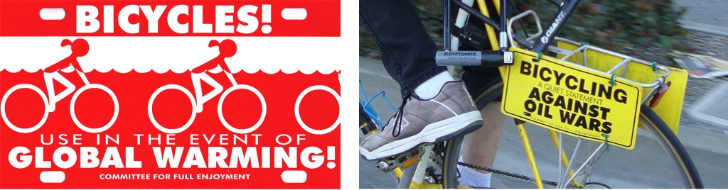 D'autres cyclistes affichent leurs opinions au sujet des problèmes environnementaux et politiques liés à la dépendance aux voitures par des pancartes qu'ils accrochent à leur vélo (fig. 4). Dans l'enquête de 2012, un total de 76,8 % des personnes ayant répondu sont d'accord et entièrement d'accord pour dire qu'elles participent parce qu'elles ne veulent pas contribuer à la consommation de pétrole. Un total de 81,2 % des personnes sont d'accord et entièrement d'accord pour dire qu'elles participent parce qu'elles ne veulent pas contribuer à la pollution environnementale.