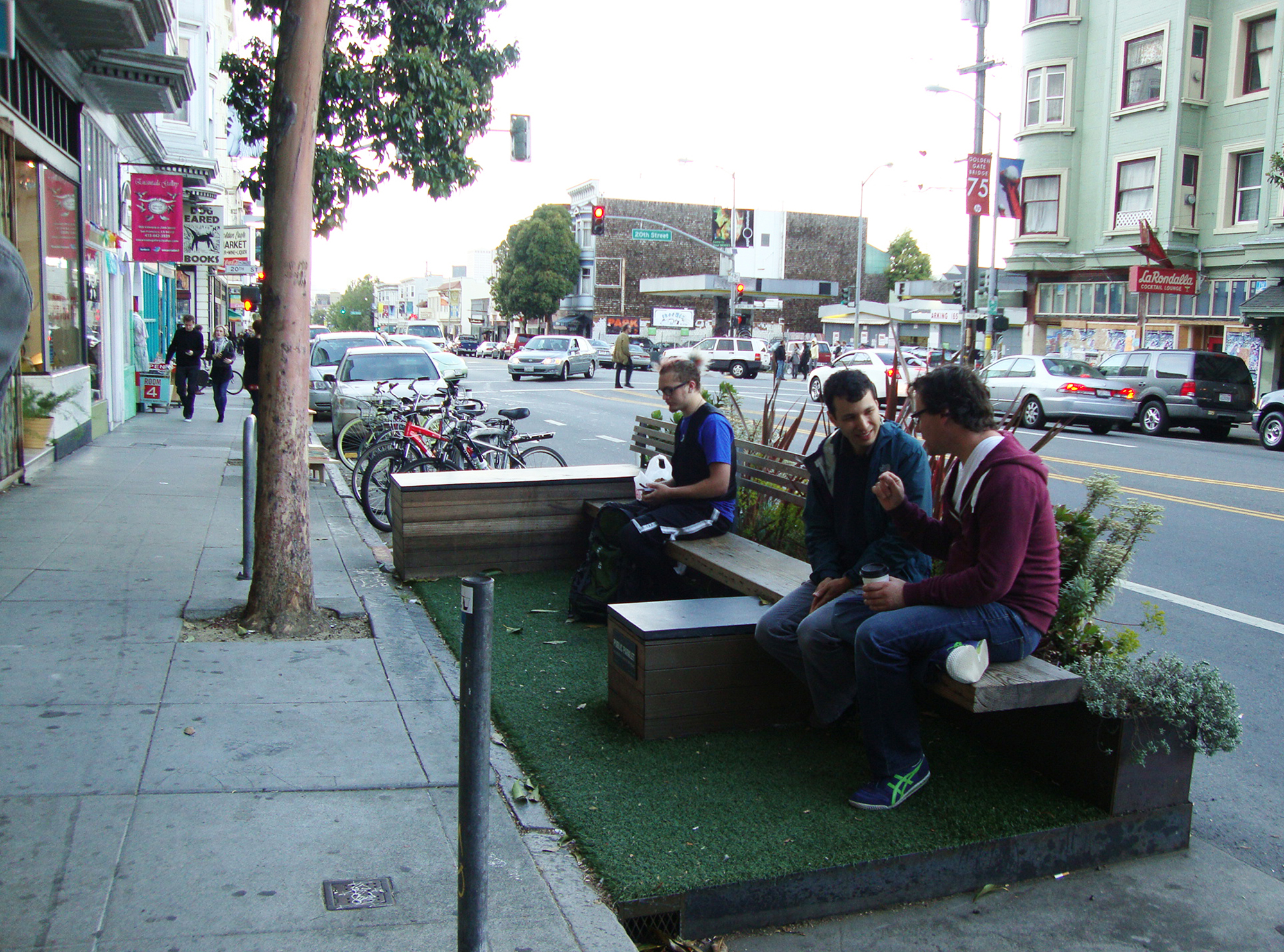 Ces dernières années, la ville a été un partenaire actif de la transformation sociale, culturelle et physique de San Francisco. Les directions de la ville collaborent depuis 2008 avec l’association Livable City (« Ville Habitable »), et avec SFBC, pour organiser la manifestation Sunday Streets. Les organisateurs de Sunday Streets ferment un quartier de la ville à la circulation certains dimanches et offrent un accès sécurisé aux cyclistes et aux piétons. Le nombre de participants est estimé à 25 000 personnes en moyenne. La ville a également initié le Pavement to Parks Program (« Programme de transformation de la chaussée en parc ») en 2009 afin d'augmenter la surface des espaces publics dans la ville. Dans le cadre de ce projet, cinq nouvelles places et 31 Parklets ont été aménagés jusqu’à présent, et d'autres sont en cours [Figure 6]. Les parklets sont des extensions de trottoirs créées en investissant des places de parking sur la rue. Le projet des parklets est né de la collaboration de la Ville avec Rebar, un studio interdisciplinaire, à l’origine du Park(ing) Day, un événement qui encourage les habitants à occuper les places de parking sur la rue, après avoir payé au parcmètre, en les transformant en espaces publics temporaires. Park(ing) Day est une autre manifestation populaire née à San Francisco en 2005, aujourd’hui célébrée dans 140 villes du monde entier.