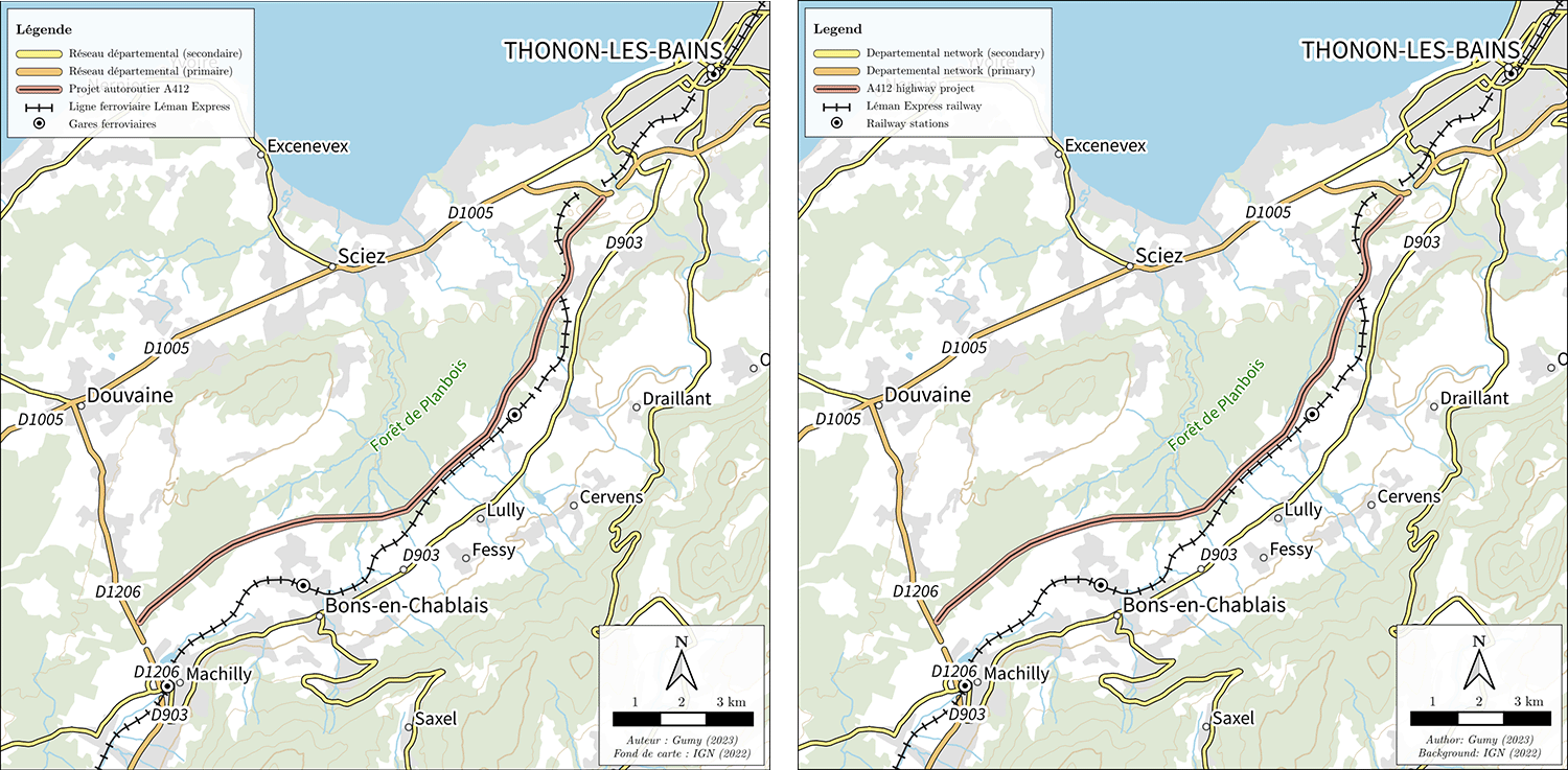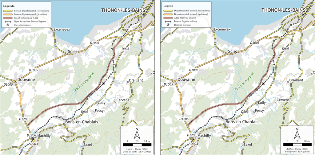 Figure 1 : plan de situation du projet d’A412 et du Léman Express. Réalisation : Alexis Gumy (2023) ; fond de carte : IGN (2022)