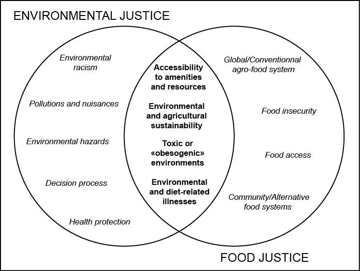 Le mouvement de la justice alimentaire est communément considéré comme un avatar de celui de la justice environnementale, les filiations entre les deux mouvements ayant été soulignées dès les années 1990 (Gottlieb & Fisher, 1996). En effet, les premières occurrences du terme de food justice dans la littérature scientifique se trouvent dans des revues consacrées à la justice environnementale, comme Race, Poverty and the Environment (Gottlieb & Fisher, 2000). Robert Gottlieb (2009) avançait ainsi que la définition de l’environnement comme « là où l’on vit, travaille et joue » devait être modifiée et transformée en « là où l’on vit, travaille, joue et mange ». L’idée d’élargir le programme de la justice environnementale pour faire une place à la question de la justice alimentaire (Alkon & Agyeman, 2011 : 7-10) était censée montrer que cette dernière s’était intégrée au concert des courants théoriques et des mouvements militants en faveur des justices – sociale, spatiale et environnementale. Un certain nombre d’enjeux communs aux deux mouvements sont mis en avant pour justifier cette filiation (graphique 1), tels que la mise en évidence d’injustices systémiques créant des environnements urbains de qualité inégale et des accessibilités différenciées aux aménités et aux ressources ; un souci de la « durabilité » environnementale ou agricole ; des préoccupations d’inégalités d’accès aux soins face aux maladies environnementales ou nutritionnelles ; l’articulation de mobilisations locales et d’enjeux globaux écologiques et alimentaires ; l’importance des enjeux centrés sur la vie quotidienne et les conditions de vie (Gottlieb, 2009 ; Gottlieb & Joshi, 2010 ; Alkon & Agyeman, 2011). Le parallèle est d’autant plus engageant que les tenants de ces mouvements militent souvent sur les mêmes types de territoires : des quartiers urbains habités par des minorités ethniques défavorisées, considérés comme des « déserts alimentaires » (food deserts)[1] (Cummins & Macintyre, 2002 ; Paez et al., 2010) et/ou des territoires subissant un lourd fardeau de pollutions et de nuisances environnementales.