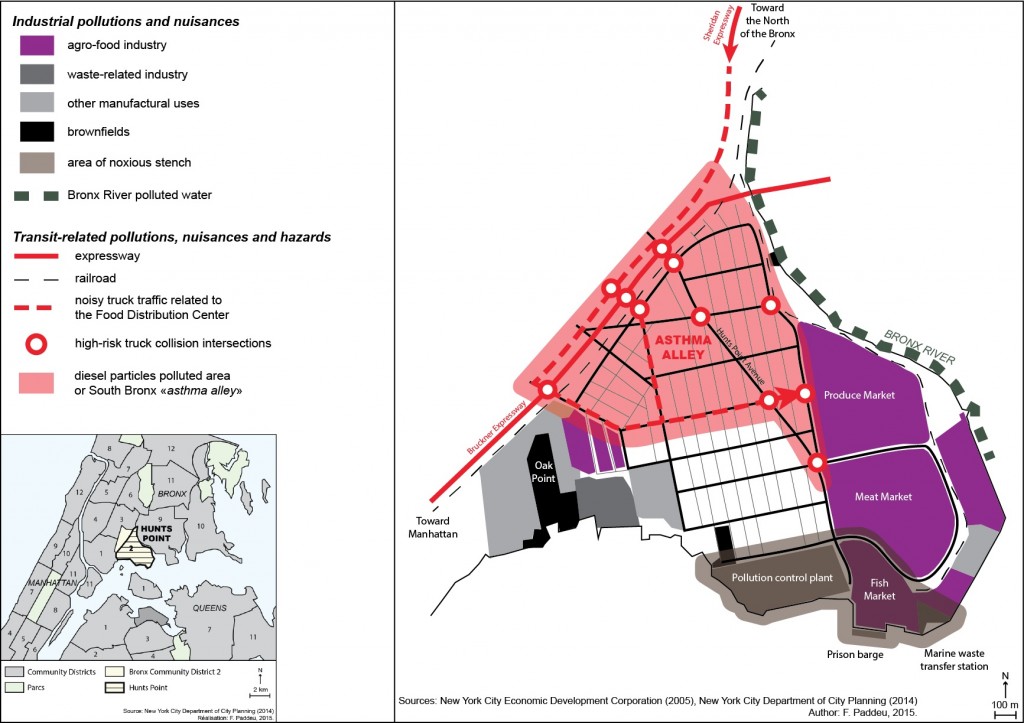 Noxious stench, polluted air, non-stop noisy truck traffic, the waterfront view blocked off by industrial plants shape everyday life for the Hunts Point community, symptomatic of an accumulation of environmental nuisances and pollution (map 1 and picture 1). There are at least 35 waste disposal infrastructures in the community (NYCDCP, 2012), approximately 13 000 trucks drive daily to and from the food market (Parrilla, 2006; NYC Mayor’s Office, 2013), and asthma-related hospitalization rates are 21 times as high as in upper-class neighborhoods in the city (Maciejczyk et al., 2004).