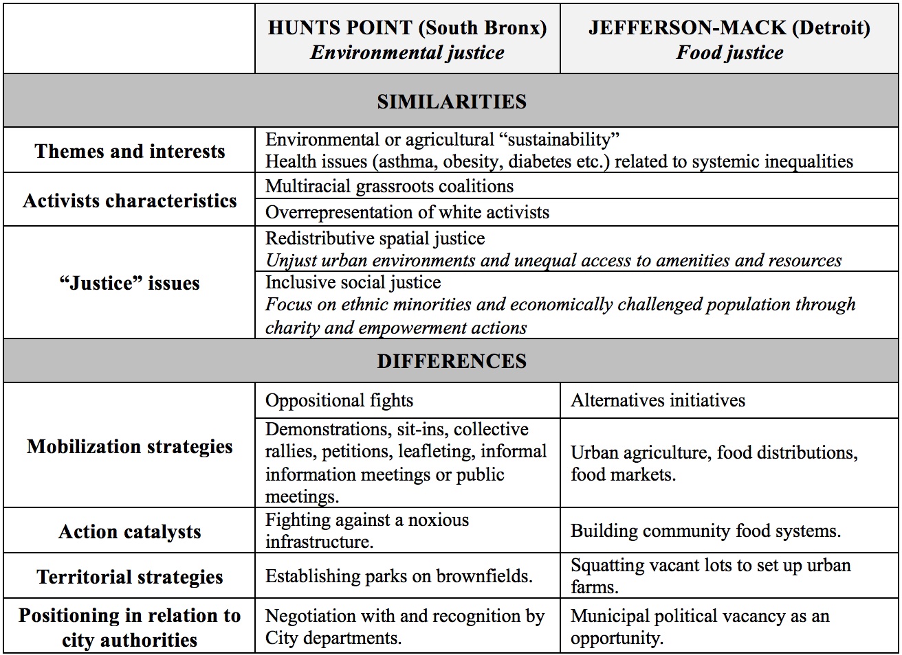 In our research on these two movements (Paddeu, 2015), we confirm that environmental justice and food justice have several characteristics in common (Gottlieb, 2009; Gottlieb & Joshi, 2010; Alkon & Agyeman, 2011) including the goal of environmental and/or agricultural sustainability, and health concerns – such as asthma, obesity, or diabetes – related to systemic inequalities. We will leave these aspects aside to concentrate on “justice” issues: on one hand multiracial organizations striving for inclusive social justice, and on the other hand the importance given to redistributive spatial justice. The following table (table 1) lists the elements we will use to compare the two movements in this article.