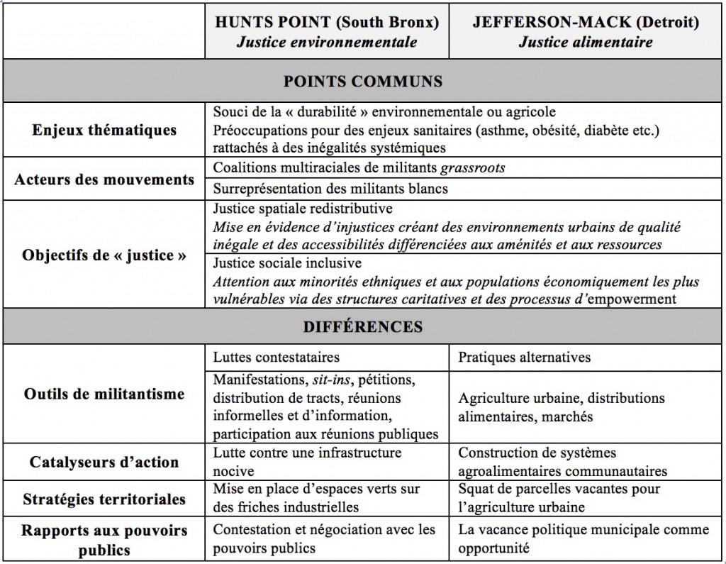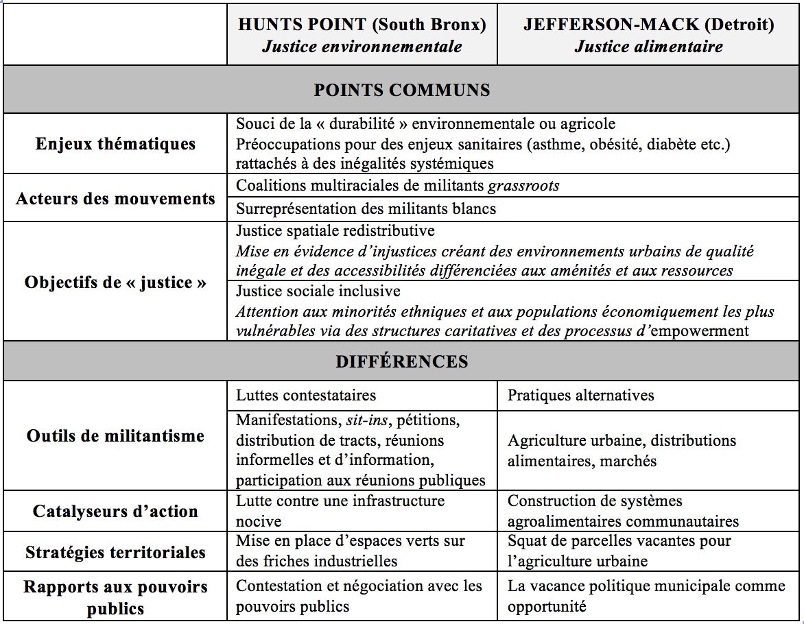 Notre enquête sur ces deux mouvements (Paddeu, 2015) confirme un certain nombre de points communs entre justice environnementale et justice alimentaire relevés par la littérature (Gottlieb, 2009 ; Gottlieb & Joshi, 2010 ; Alkon & Agyeman, 2011) tels qu’un souci partagé de la « durabilité » environnementale ou agricole, ou des préoccupations pour des enjeux sanitaires – tels que l’asthme, l’obésité ou le diabète – rattachés à des inégalités systémiques. Nous laisserons ici ces éléments de côté afin de nous concentrer sur les enjeux liés à la « justice » : d’une part l’attention à une justice sociale inclusive par des associations multiraciales et d’autre part l’importance accordée à une justice spatiale redistributive. Le tableau (tableau 1) ci-dessous présente les éléments de comparaison entre les deux mouvements qui seront développés au cours de l’article.