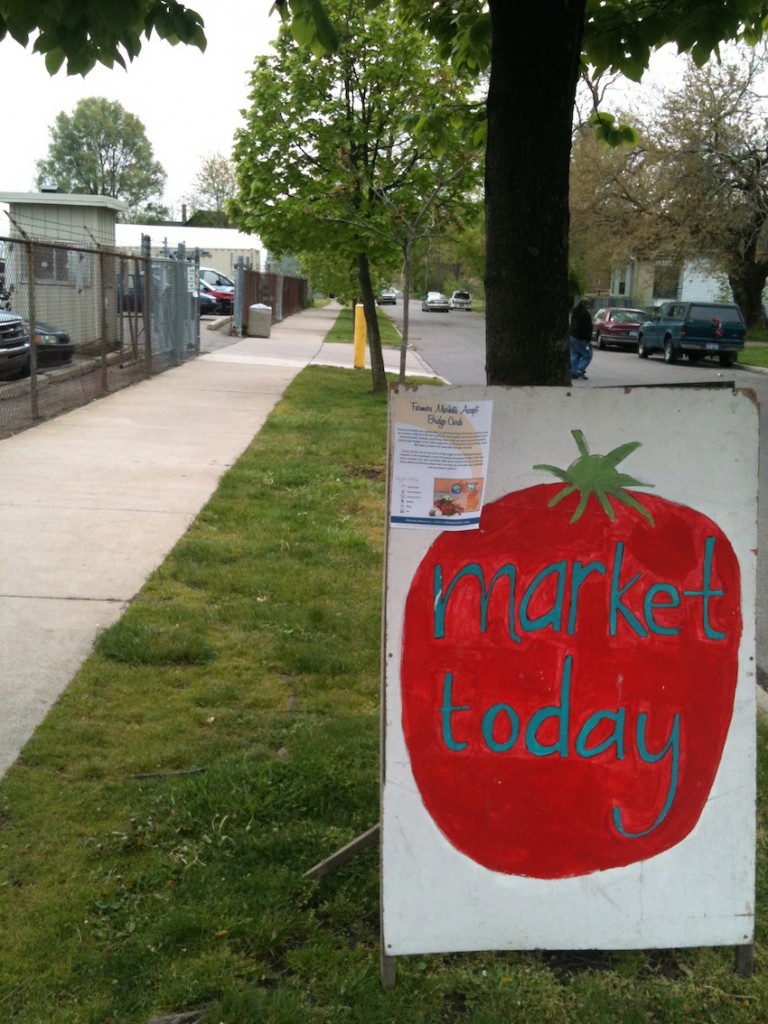 A sign announcing a food market at the entrance of Earthworks urban farm. Source: F. Paddeu, 2012.
