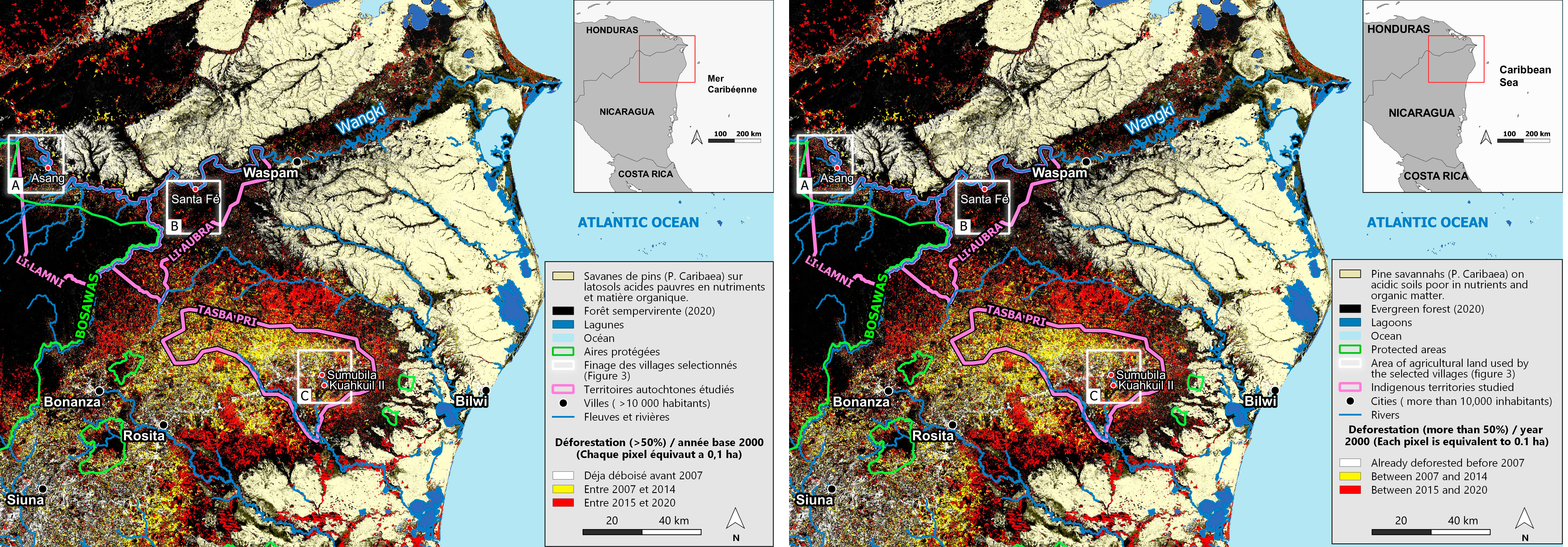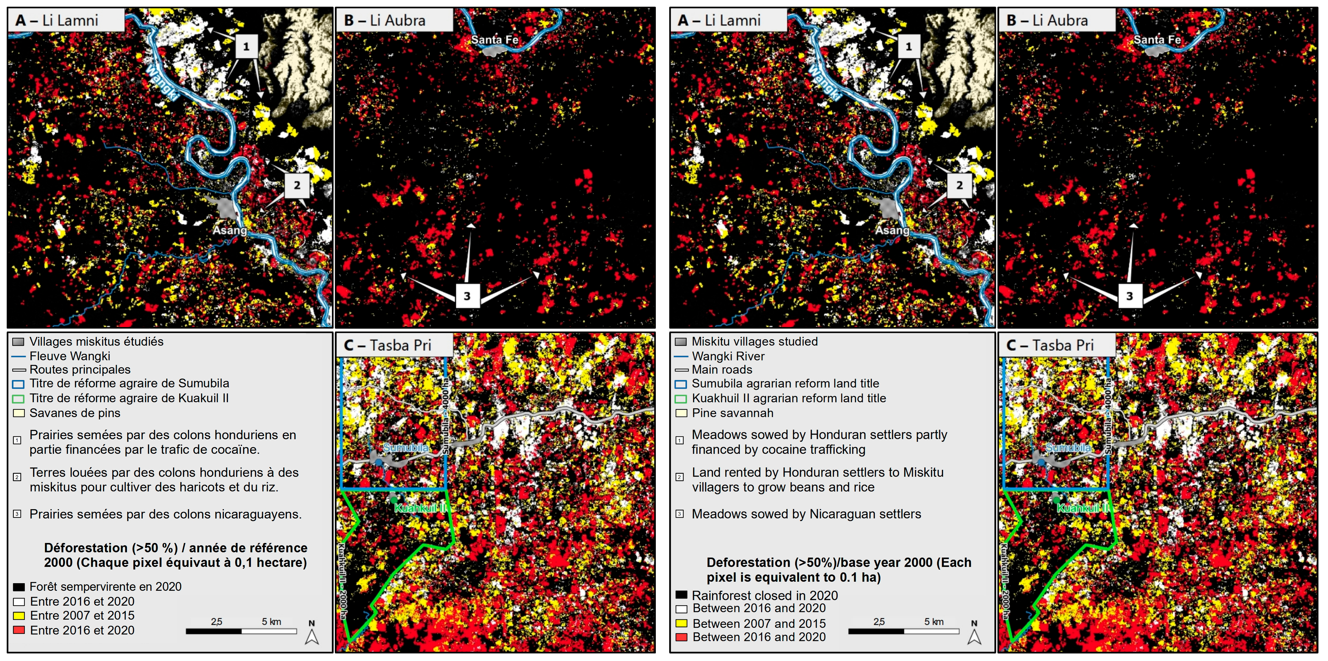 Conducted from a perspective of comparative agriculture (Cochet, 2015; Cochet et al., 2007), undertaken within the framework of the TruePath programme, and jointly funded by the National Research Agency, this study is based on long-term fieldwork. This entailed semistructured interviews conducted with farmers in 2015, then between 2018 and 2020, in three areas referenced as “Miskitu” and exposed to varying degrees to the influx of agricultural colonists: for 7 months between 2019 and 2020 in the village of Asang (Li Lamni territory); then 3 months in 2018 in the village of Santa Fé (Li Aubra territory); and finally, 5 months in 2015 in the villages of Sumubila, Kuakuil II and Kukalaya (Tasba Pri territory) (figure 2). This research also uses data on forest loss produced by the University of Maryland’s Global Land Analysis and Discovery laboratory in partnership with GFW, through the analysis of chronological Landsat satellite images. The field materials are essential for interpreting these georeferenced data, which in return are used to precisely spacialise the mechanisms identified by means of in situ surveys and landscape observations. Combining these two sources of data thus provides unrivalled material for a study of the processes underway in Mosquitia territory.
