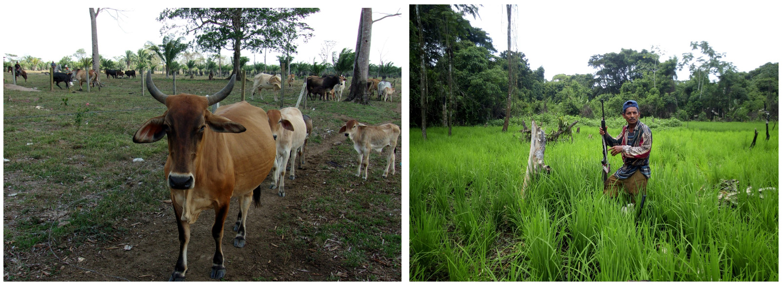 Figure 5 : Élevage bovin de tiers allochtones installé à proximité sur des terres accaparées (gauche) et agriculteur miskitu du village de Santa Fé venu travailler sa parcelle de riz (droite). Source : auteurs, 2018