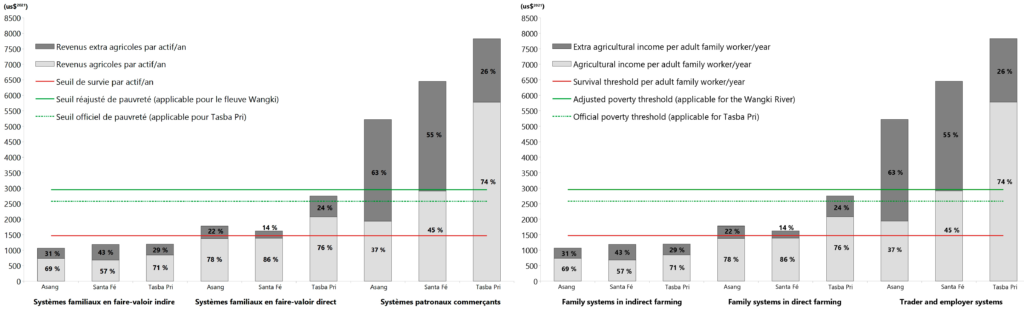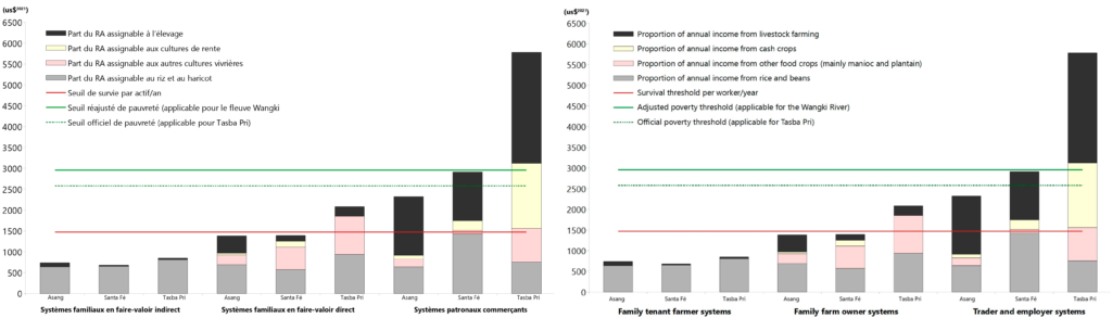 Figure 6 : Comparaison des revenus agricoles (RA) par actif familial pour les différentes catégories de foyers ruraux miskitus, intra- et inter-village, au regard des seuils de survie et de pauvreté[10]. Source : enquêtes ; réalisation : auteurs