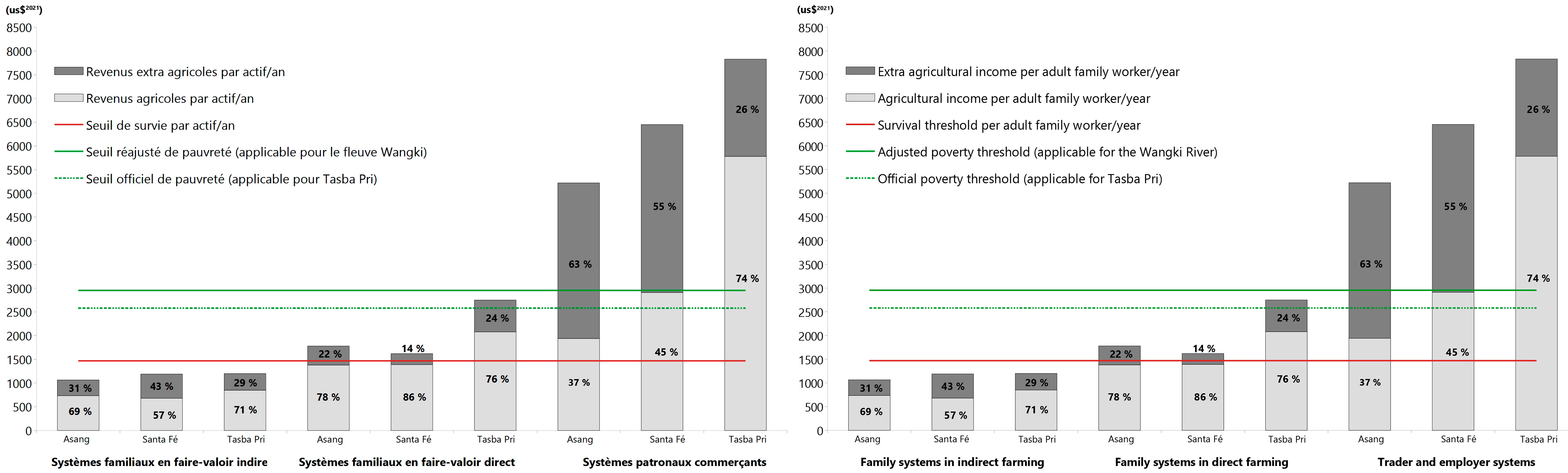 Applying a reasoned sampling process designed to represent the different social categories identified independently of their numbers in the villages, our techno-economic surveys[8] were used to model the economic results of the different production and labour systems employed (Cochet and Devienne, 2006) by Miskitu families within the three territories studied. To facilitate the comparison of farming revenues per economically active family member,[9] three of these productions or working systems per village were chosen in figure 6, illustrating each of the three social categories.