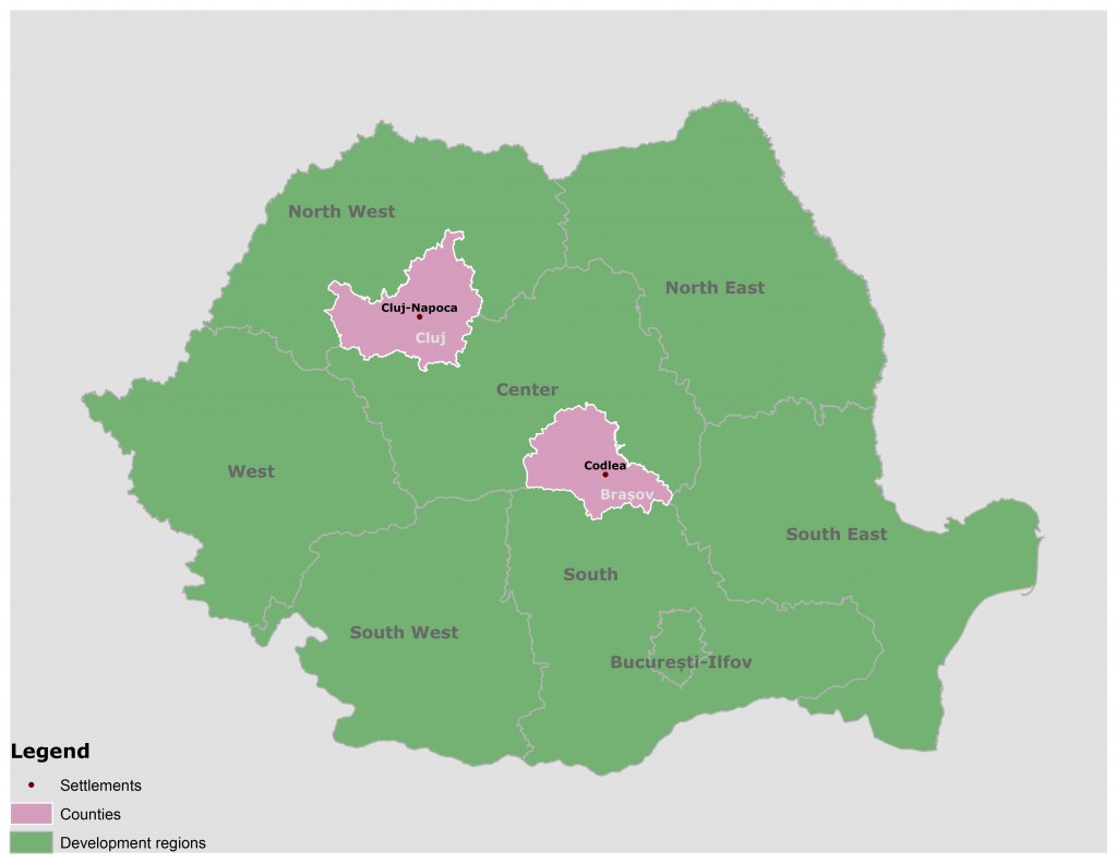 Map 1. Municipality of Cluj-Napoca (Cluj county) and Codlea (Brașov county) on the map of development regions of Romania (map courtesy Veress Ilka).