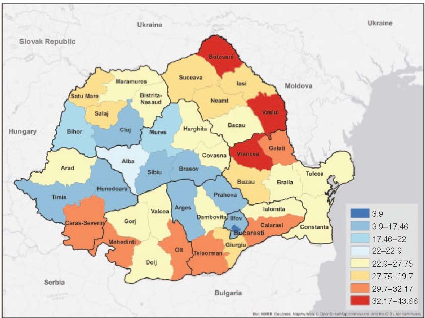 Map 2. At-Risk-of-Poverty Rates, Romania – Counties (NUTS 3), Source: World Bank – Pinpointing Poverty in Romania, March 2016.