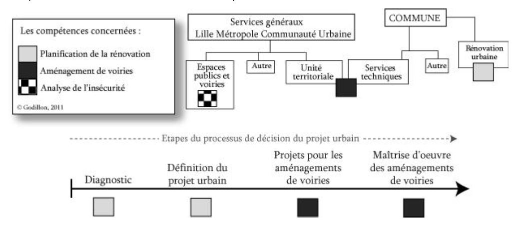 L’organisation institutionnelle de l’agglomération lilloise éclate les acteurs spécialistes de l’analyse des accidents, de ceux qui aménagent les espaces publics et de ceux qui sont en charge du projet de rénovation urbaine. Les analyses de l’insécurité sont réalisées au sein du service « Espaces Publics et Voiries », alors que les aménagements sur les voiries sont réalisés par les services techniques des Unités Territoriales correspondant au quartier. En outre, les services communautaires n’effectuent pas d’aménagement sans l’accord communal dans la mesure où les communes ont des compétences sur la voirie (éclairage, stationnement…). Cet éclatement n’est pas pallié par une consultation des spécialistes de l’insécurité lors du processus de décision du projet urbain comme le montre le schéma.