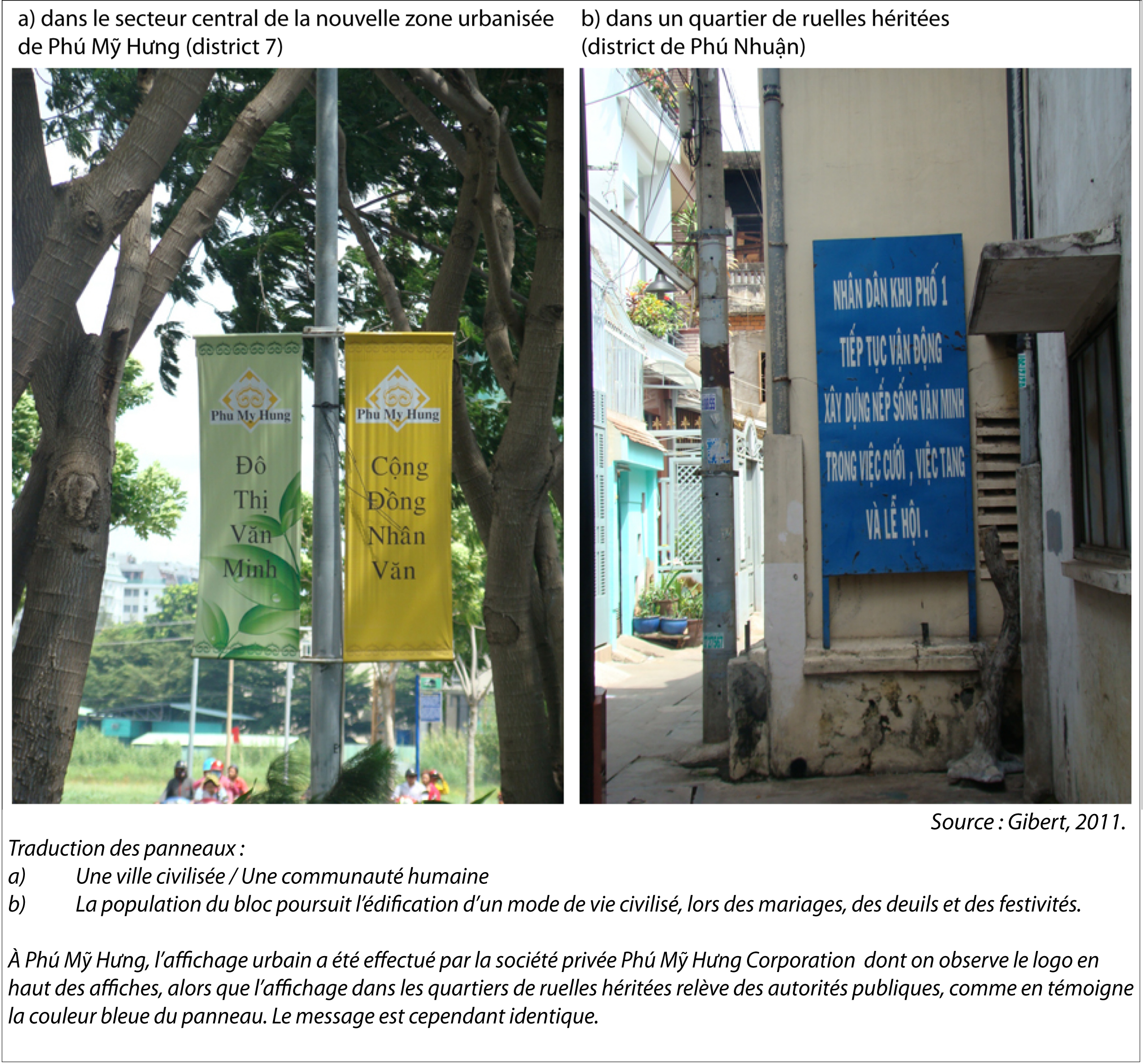 Les projets urbains associés à la « modernité » et la « civilisation » sont rarement contestés ou remis en cause en tant que tels par les citadins, qui en acceptent généralement les principes, notamment urbanistiques. Aucun modèle de ville alternatif ne vient par exemple contrer les normes de la « métropole moderne » portées par les autorités. Cet assentiment[6] témoigne de l’efficacité de la « gouvernance douce » (soft governance) du régime vietnamien, qui parvient à imposer sa vision du développement par le biais de ses nombreuses campagnes de propagande, n’hésitant pas à invoquer des référents nationalistes. Pour Nguyễn Thị Thanh Bình, cette « governance via culture despite being a "soft" mode of governance, has become a modern principle of contemporary vietnam socialism » et participe, au même titre que les politiques et règlements coercitifs, à orienter les façons de vivre et les pratiques spatiales des habitants (2010, p.123).