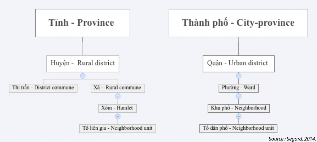 The Socialist Republic of Vietnam is one of the last communist states ruled by a single political party, which is the architect of the current economic liberalisation but remains the only holder of the political power. Since the 1986 Đổi Mới (« Renovation »)reforms, international organisations – such as the World Bank – have raised the country as a model of a successful economic transition, from collectivism to market economy (World Bank 1996).Despite this positive image, the country was still ranked 174 out of 180 for press freedom by Reporters Without Borders in 2014, and 166 out of 177 according to Transparency International Corruption Index in 2013[1]. At the same time, Vietnam is regularly criticized for dissidents’ or critical bloggers’ arrests. The Vietnamese party-state still subscribes to the political organisation model of « Democratic Centralism »: it mobilizes and controls the entire population through mass organizations, which supervise close to ¾ of the population (Norlund 2007). The regime maintains its power through a system of socialist political structures, that covers the entire territory up to a very fine scale and offers the central power various relays at every level of the nation.