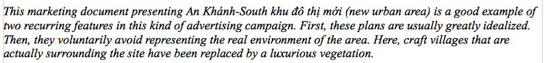 [6] Si les habitants s'opposent aux modalités de leur mise en œuvre, l'adhésion à ce modèle «moderne » et à ses objectifs a été exprimé à plusieurs reprises lors de nos enquêtes de terrain, notamment lors des projets d'élargissement de la voirie à Hồ Chí Minh Ville ou pour les projets de zones urbaines nouvelles dans les villages de métier du delta du Fleuve Rouge.