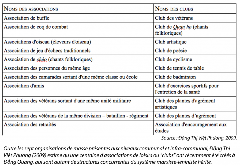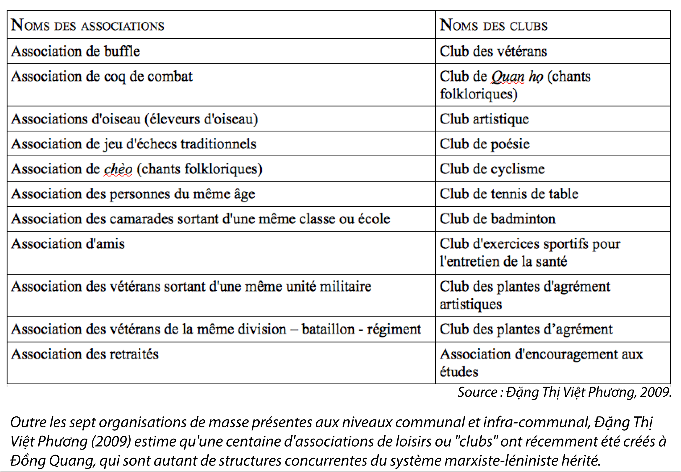 Les organisations de masse sont par ailleurs concurrencées par la montée en puissance des associations autonomes, telles que les réseaux d’anciens élèves ou les associations professionnelles ou de loisirs, qui fédèrent des adhérents sur une base extra-territoriale, autour d’une communauté d’intérêts. Même au sein des communautés villageoises se multiplient des kyrielles d'associations qui sont des espaces de discussion, de rencontres informelles, d'entraide et de construction d'un capital social en dehors du cadre institutionnel hérité du système socialiste (Ill. 4). Pour Russel Dalton et Nhu Ngoc Ong « since opposition political parties are prohibited, these non-political groups might serve as outlets for casual political discussion with fewer chances of being accused of law-breaking » (2003, p.9).