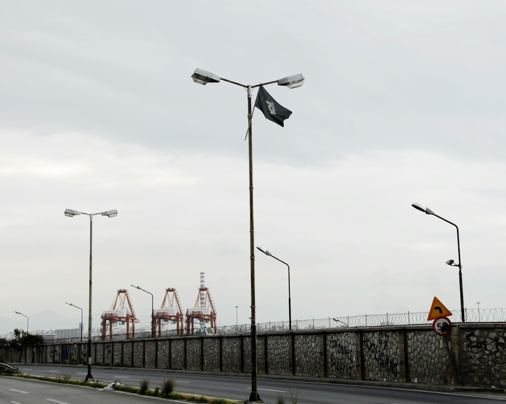 Figure 2. A Golden Dawn flag flutters from a lamppost near the industrial port between Keratsini and Perama.