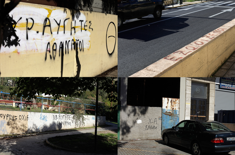 Traductions des graffitis sur les murs du quartier (de gauche à droite) : « Aube dorée immortelle », « Aube dorée, des costauds », « A.D. (Aube dorée), la Grèce », « Dehors les étrangers ».