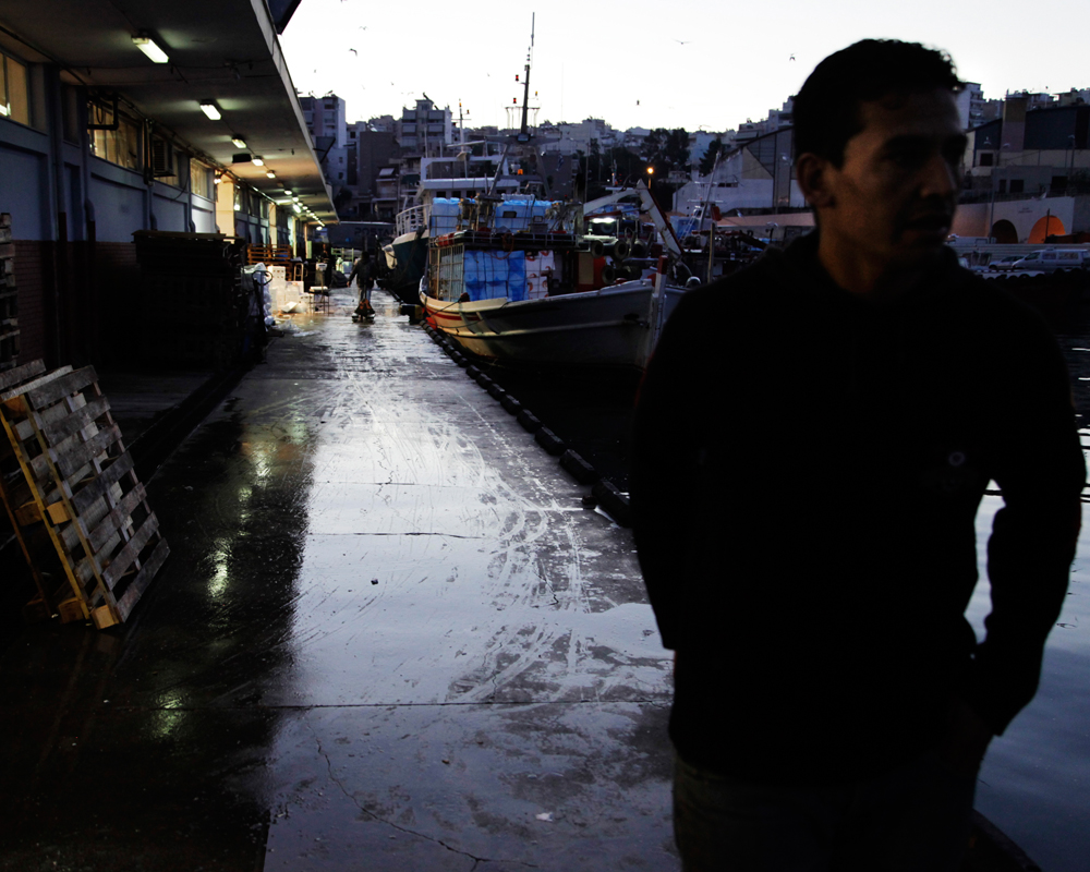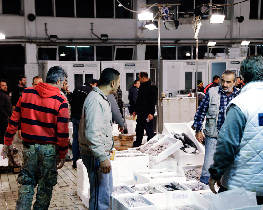 A la criée, le portail est très lâchement contrôlé : à l’instar de nos hôtes, nous le passons sans encombre un matin avant l’aube. A l’intérieur de la grande halle résonnent les apostrophes en grec, albanais et arabe. Parmi la centaine de vendeurs et d’acheteurs, Grecs, Albanais et Egyptiens se comptent à parts égales, emmitouflés dans de lourds habits de travail. Les rares femmes présentes servent le café ou tiennent les comptes. Débarquées des chaluts qui rentrent à peine d’une nuit de pêche, les caisses de poissons jonchent le sol, répandant une eau glaciale qui pénètre les chaussures. Les poissonniers égyptiens délivrent des autorisations factices aux revendeurs à la sauvette, dont la petite bande de colocataires, pour que ceux-ci puissent acheter au prix de gros. Les négociations sont parfois houleuses, même si toutes les nationalités paraissent sur un pied d’égalité. Les achats et l’empaquetage effectués, les acheteurs s’en retournent à leur appartement quand le ciel commence à rosir. Hadi résume d’un ton monocorde sa journée, semblable à celle de ses colocataires :