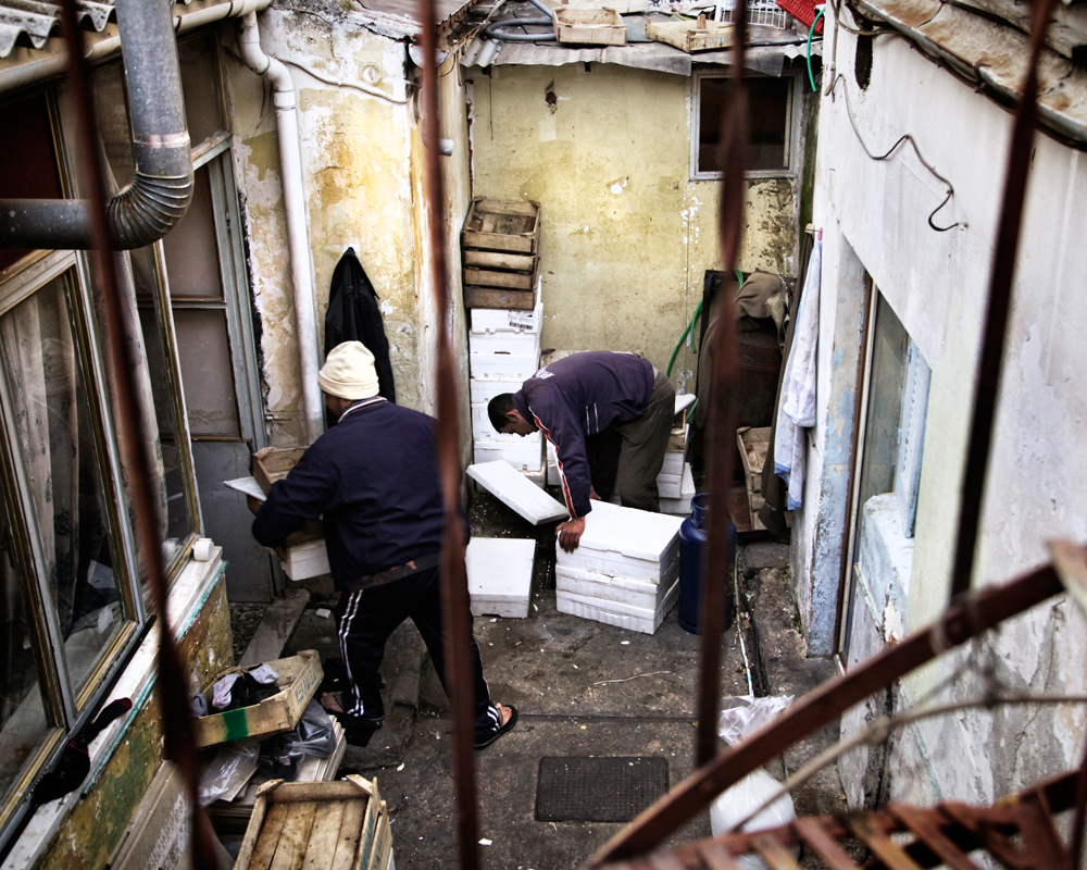 Back to the flat after having bought fish at dawn, two of the flatmates sort fish boxes in the inner court.