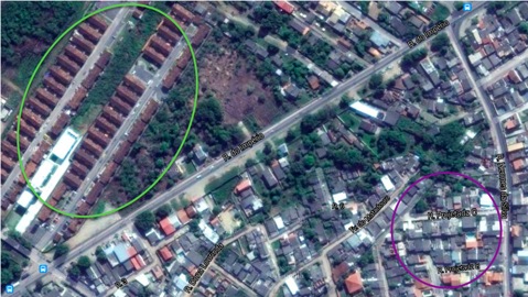 Fig. 1.3: Satellite image of Santa Cruz, suburb of Rio de Janeiro (green circle: Low-rent housing in the social housing project “Minha Casa, Minha Vida” (My House, My Life) of the Lula and Dilma government (Workers party – PT); purple circle: subdivisions.