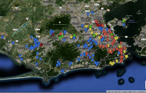 Fig. 3: Map of the armed territorial control in Rio de Janeiro updated in 2014:Militias (blue) and Drug Trafficking (« Comando Vermelho » (red), « Amigos dos Amigos » (yellow) and « Terceiro Comando Puro » (green))[8]