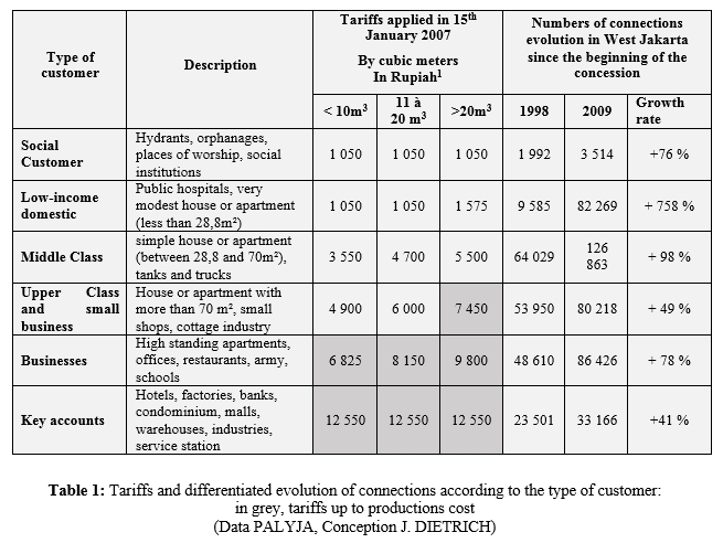 Table 1. Prices in January 2007 and evolution of differentiated connections according to the type of consumer: in grey, prices higher than the production cost
