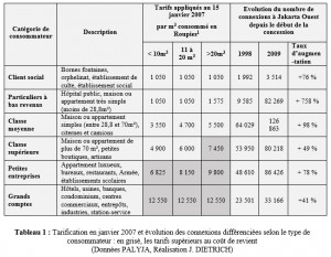 Of course, low investments by the public authority did not lead to a reduction in water access inequalities, thereby contributing to keeping a section of the population in a precarious situation (Crane, 1994). In 1998, at the time of the establishment of concessions, the network coverage rate was 33,9%. Confronted with this crisis which was also being experienced in other megalopolises, governments from the countries of the South and international development aid agencies expressed, as early as the 1980s, the wish to supply drinking water to all city residents by the end of the International Decade for Drinking Water and Sanitation (1980-1990). To reach this objective, States engaged into social policies for connecting low income populations, water network extension programmes and the establishment of subsidised prices. As early as 1975, the government of Jakarta engaged into a vast programme for the distribution of water to the disadvantaged areas that had not previously benefited from network extension works (Bakker and al., 2006). The World Bank and the Indonesian Department of Public Works financed the installation of public fountains for 120 000 people. For those living further away from the network, water trucks were made available in addition to wells. Subsidies for household connections represent the most expensive programme, depending on the network location, water pressure and quality. In parallel, many public latrines called MCK and managed by private actors were created. These installations are found in large numbers in poor areas and informal settlements.