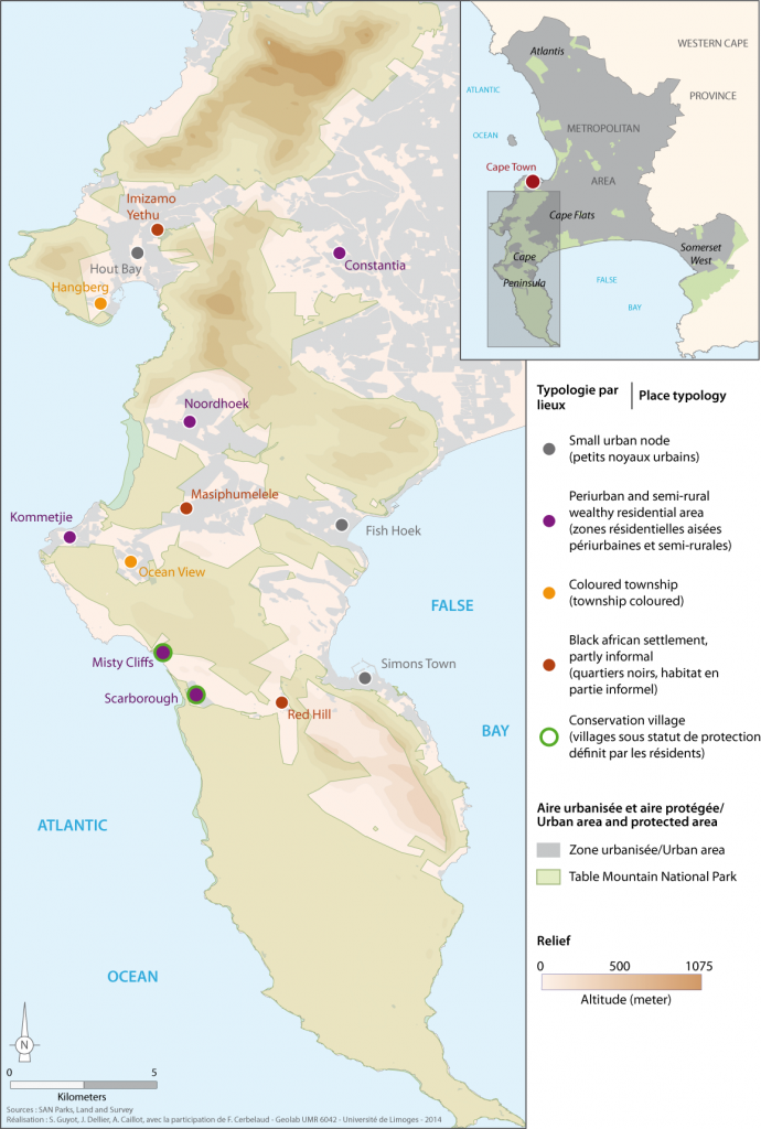 In South Africa, the Cape Peninsula was the first territory to be colonised by the Whites in the 17th century. Cape Town, one of today’s three major metropolises in the country, was developed in the North. To date, the centre and south of the Peninsula are still not strictly part of the urban continuum and, rather, constitute a peri-metropolitan area, often taking on a semi-rural aspect. This area (Map n°2) is made up of small urban nodes (Hout Bay, Fish Hoek, Simons Town), a periurban and semi-rural residential area (Noordhoek and Scarborough) which is sometimes agricultural (the vineyards of Constantia), punctuated by two Coloured townships (Hangberg and Ocean View) and several partly informal African settlements (Imizamo Yethu, Masiphumelele and Red Hill).