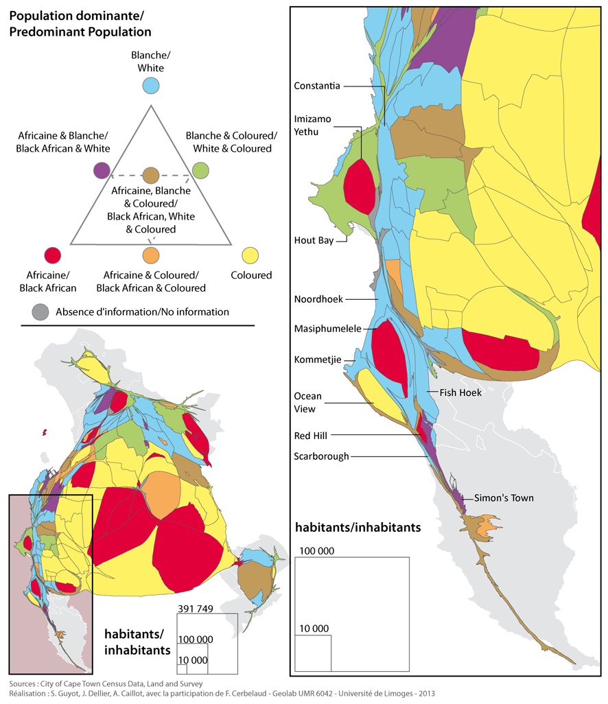 La croissance d’Imizamo Yethu et de Masiphumelele a bouleversé les équilibres démographiques entre Blancs, Coloureds et Africains sur la Péninsule. Ainsi, lors du recensement de 1996 on comptait seulement 14 000 Noirs, alors qu’ils sont près de 50 000 au recensement de 2011 (carte n°3). Nombre d’anciens résidents blancs s’inquiètent de cette nouvelle promiscuité urbaine et se saisissent d'un renouveau de « leur » ruralité héritée comme d’un possible rempart.