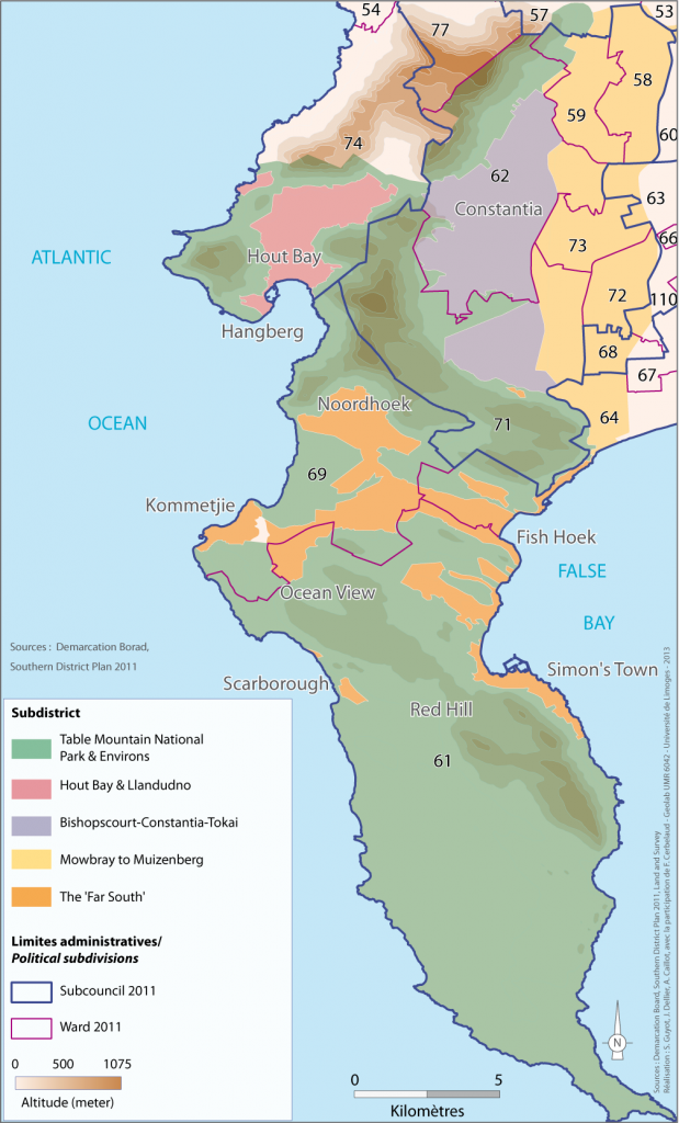 Our methodology consisted of bibliographic work as well as field work carried out in March 2013 and April 2014 for the UNPEC project in the Cape Peninsula. Thirty-five people were interviewed. A systematic electronic survey with residents’ associations was carried out, and a spatial database was built. Field and written interviews were carried out essentially with the representatives of residents’ associations, metropolitan ward councillors, civil servants and National Park representatives. Cartographic databases (on a cadastral scale) relied in particular on the interpretation of photos complemented by verifications carried out on site by the authors. The surveys focused on the formerly rural areas of Constantia, Hout Bay, Noordhoek, Kommetjie and Scarborough–Red Hill.