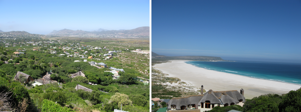 Photo n°4: Views from Chapman’s Peak Road: the loose residential fabric of Noordhoek (left) and the Monkey Valley Resort in front of Noordhoek beach (right). (Photos by the authors, 2013)