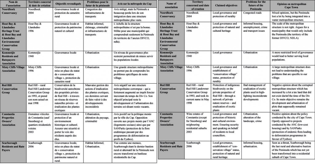 Most of the Peninsula’s territory was administered by the Divisional Council (DIVCO) created in 1855, and by the Regional Service Council (RSC) from 1985 to 1995, both being rural administrative authorities under apartheid. Within the Peninsula territory of the DIVCO, several rural localities, similar to villages made up of scattered houses, also have their own local councils: Llandudno, Hout Bay, Constantia, Noordhoek, Kommetjie and Scarborough. This implies that residents are strongly linked to their local organisation. As early as the end of apartheid, the Peninsula was progressively integrated into the Cape Town metropolitan authority. In reaction, residents created several tax payers’ associations (see Table n°1).