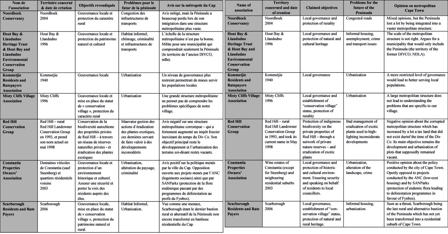 Les objectifs poursuivis par les associations de résidents actives sur la Péninsule du Cap ont une portée territoriale évidente versée dans la critique d'un pouvoir métropolitain trop éloigné des enjeux du localisme. Ces associations militent toutes, à des degrés divers, pour influencer les décisions d'une gouvernance locale confisquée par l'autorité métropolitaine à la fin des années 1990, en investissant la sphère de la participation politique (sur Johannesburg voir Bénit-Gbaffou Claire et al., 2012) elles organisent de nombreuses réunions publiques, et en commentant les différents documents d’urbanisme et de planification. La référence faite aux localités historiques dans les différentes dénominations des associations (Constantia POA, Hout Bay RRA, Noordhoek C, Kommetjie RRA, Scarborough VA, etc.) est un héritage des conseils locaux (local councils) actifs du temps de l'apartheid, au sein de l'autorité rurale du DIVCO.
