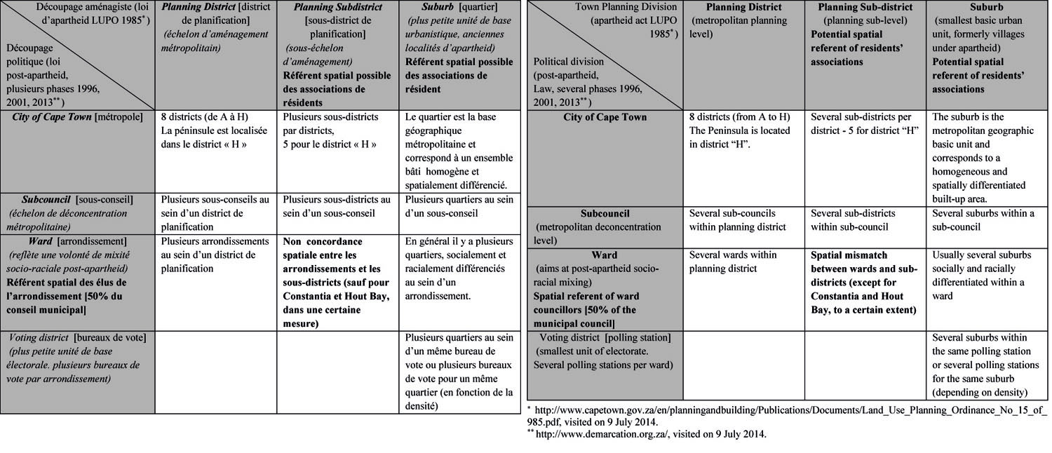 Tableau n° 2: emboîtement des découpages « politiques » versus découpages « de planification» dans la Péninsule du Cap