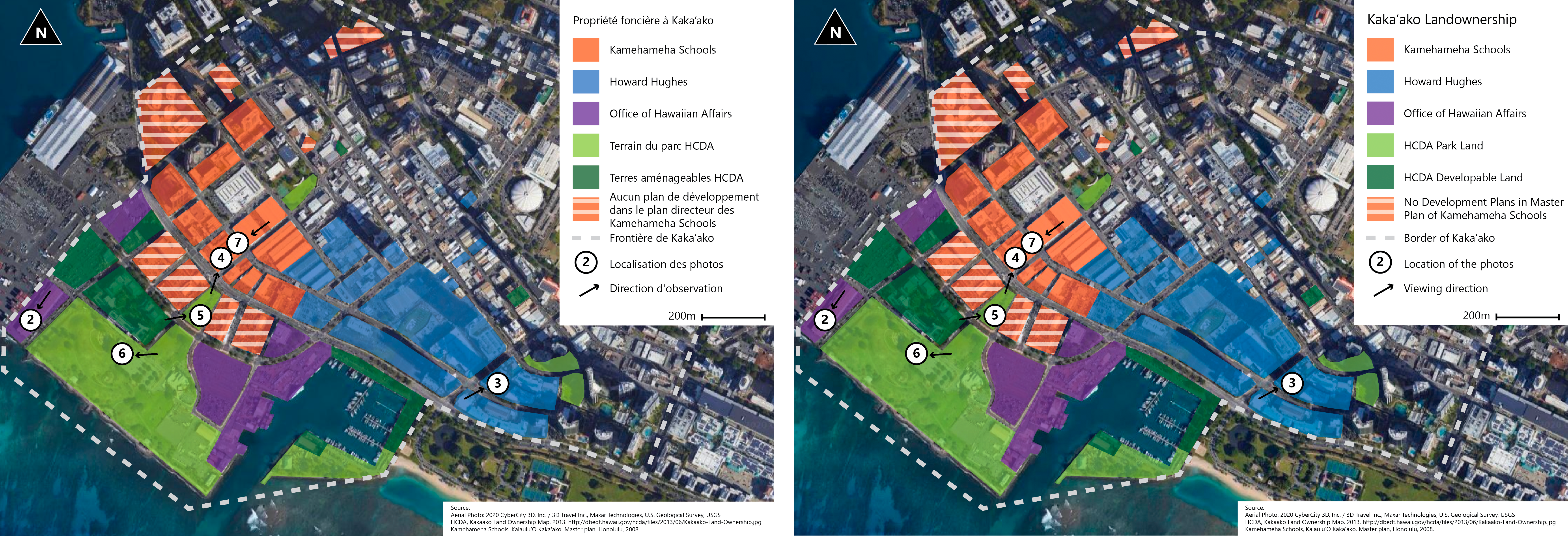 Figure 1 : Carte de la propriété foncière à Kaka'ako avec la localisation des photos du présent article © Holzinger, 2020