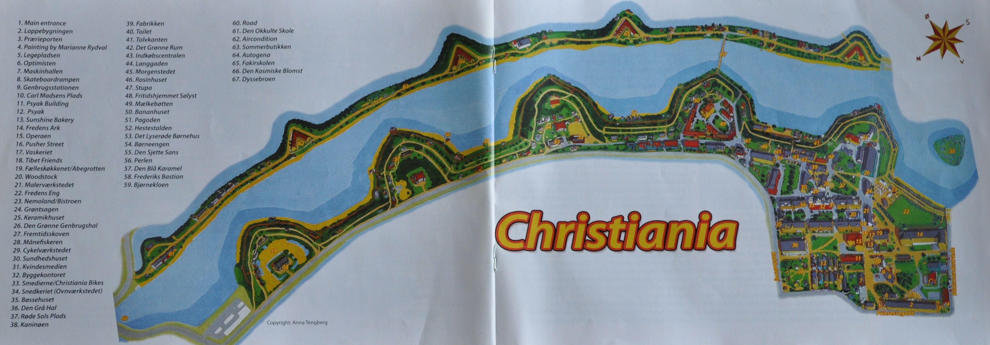 [25] Certains résidents comparent la carte de Christiania à un phallus, la zone la plus densément peuplée figurant le scrotum.