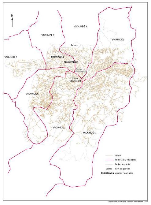 This article analyses forms of security production in two poor neighbourhoods[1] of Yaoundé (Map 1). We look at security in terms of practices and even policies which are more or less institutionalised and are meant to ensure the protection of individuals and properties. By conducting surveys in poor neighbourhoods, we must be able to show the gap between the theoretical public security offer and the reality on the ground. Such a gap opens various reflections on spatial inequalities to access security, and on the feeling of injustice experienced by populations without protection. When this feeling is linked to a spatial location, we speak of spatial injustice.