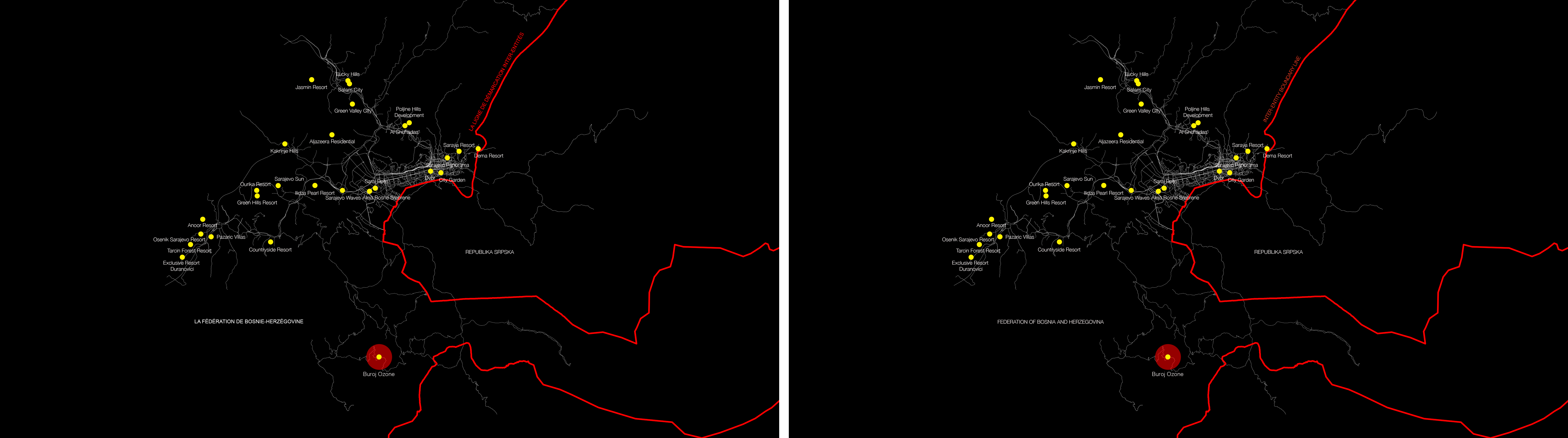 Certains éléments des accords de Dayton ont, à mon sens, servi de efficaces pour procéder à un processus d’accumulation par dépossession, dont la marchandisation des terres se révèle être l’une des composantes majeures (Harvey, 2003). Ainsi, la LDIE s’est avérée être l’un des principaux instruments à avoir facilité l’acquisition de terrains à bâtir dans le cas de Buroj Ozone, un projet de ville nouvelle à vocation touristique situé sur la commune de Trnovo, que je décris plus en détail ci-dessous. La LDIE n’a pas seulement eu pour effet de structurer le pays en deux entités distinctes ; elle constitue aussi une limite entre deux systèmes de gouvernance qui traitent de manières très différentes les questions d’aménagement, d’organisation spatiale et de protection environnementale. La zone à terme occupée par le développement de Buroj Ozone a longtemps fait partie d’un territoire qui devait être classé parc national. Le fait que ce territoire n’ait pu être juridiquement pris en compte dans son intégralité a joué un rôle majeur dans l’incapacité des pouvoirs publics à protéger la zone concernée, dès lors livré à l’exploitation et aux manigances juridiques.