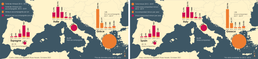Figure 1 : Arrivées de migrants mineurs non accompagnés en Europe méditerranéenne 2015-2019. Carte d’Elizabeth Rose Hessek, octobre 2021. Sources : Vives et Williams (2021), Fiscalía General del Estado (2020)